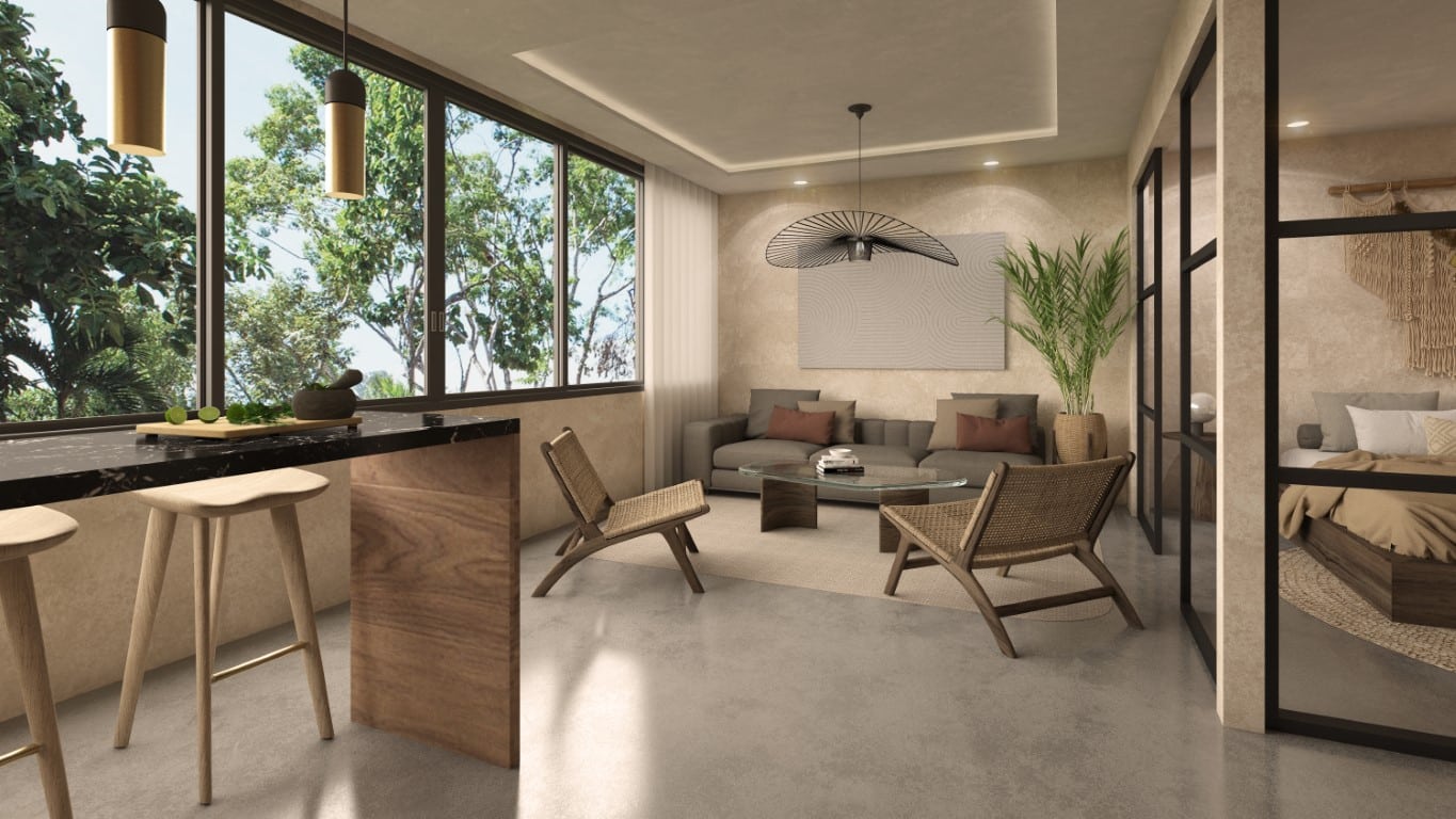 - Regional Elegance: Interiors adorned with beige Chukum, black aluminum, tzalam/parota wood, and Mayan rock details.