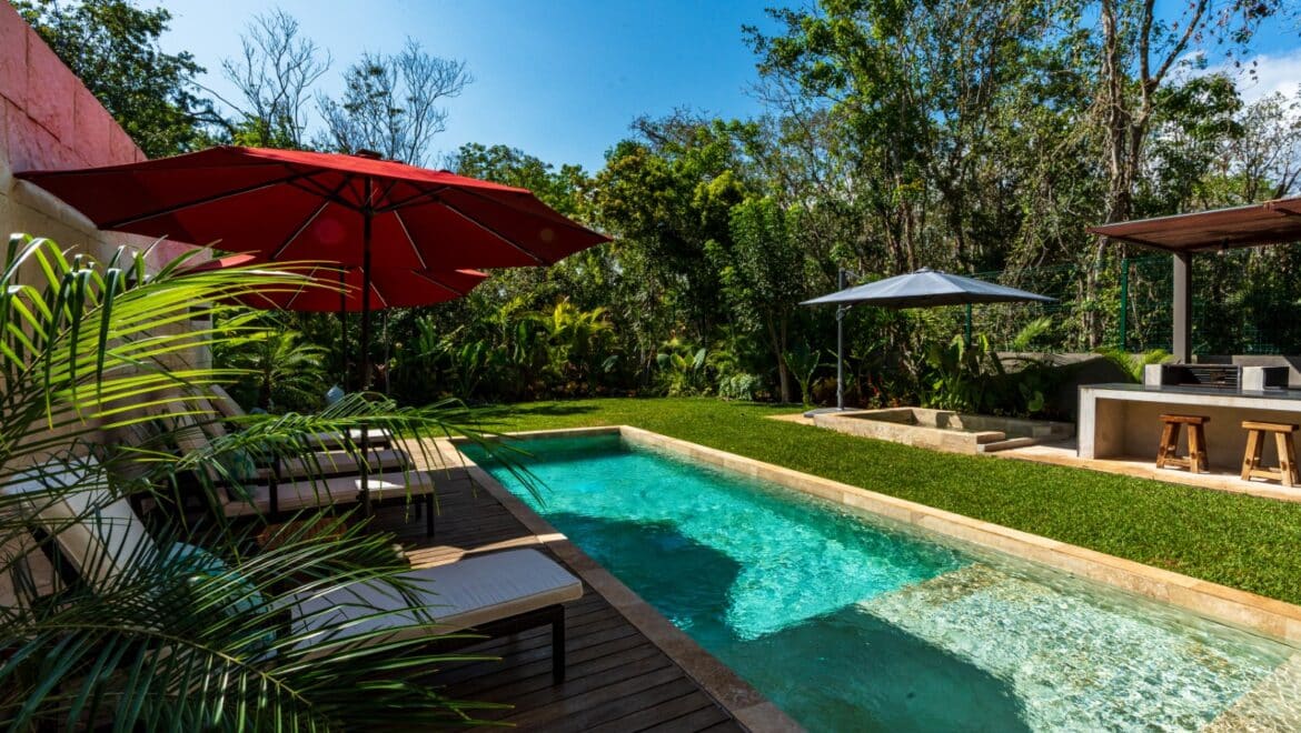 Step into a lush private garden where a sun-drenched swimming pool is surrounded by shaded seating areas, perfect for relaxing or hosting friends. The outdoor space is designed to enhance the experience of tropical living, with seamless transitions between indoor and outdoor zones.