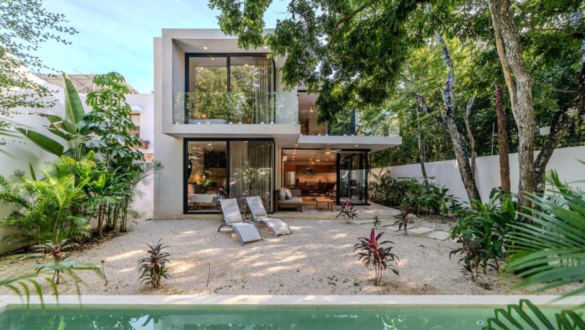 Outdoor areas play an important role in the overall design of the home. The backyard features a private swimming pool and sun deck, creating an inviting setting for relaxing afternoons or social gatherings. Surrounding tropical landscaping enhances privacy while maintaining the natural character that makes Tulum unique.
