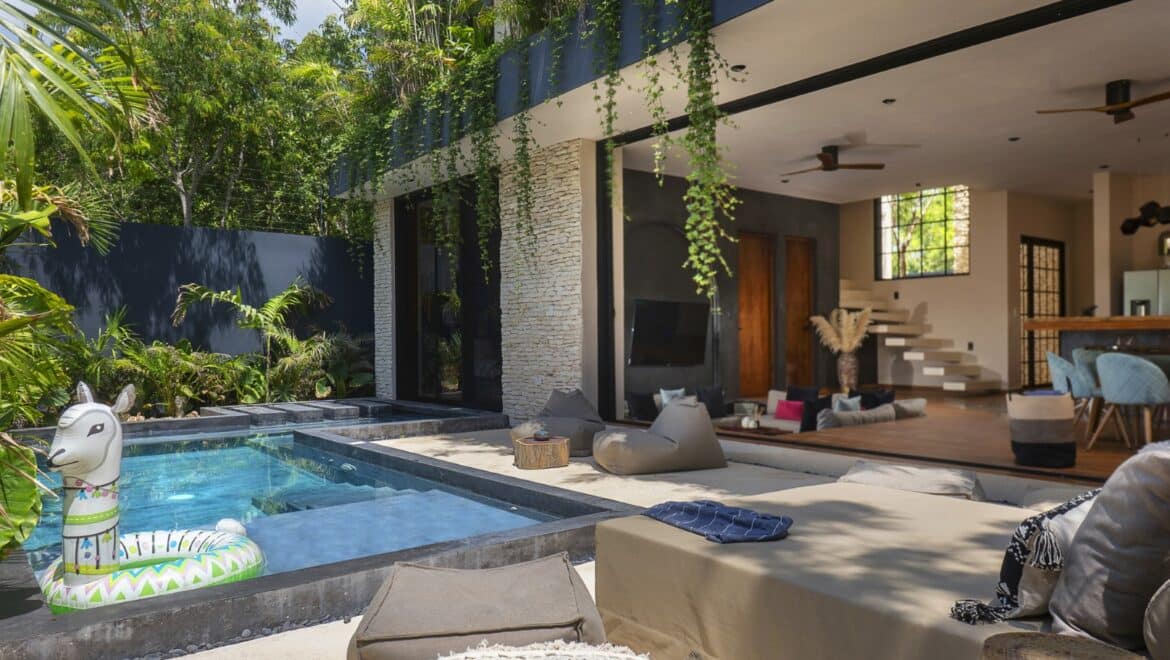 This Tulum villa stands out for its dual private pools, adaptable rooftop, and proximity to the coast while remaining set within a quieter residential environment.